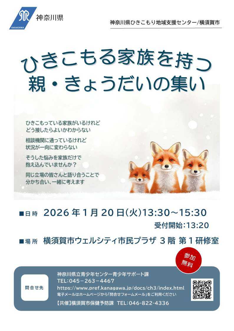R8年1月20日に神奈川県と共催で、ひきこもる家族を持つ親・兄弟の集いを開催します。